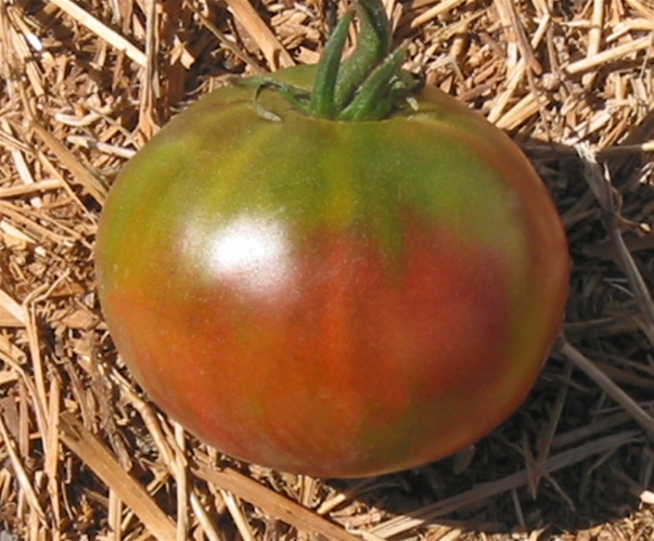 A real beauty and early ripening.  Heavy sets of unripe fruit show lots of purple, which is brought on by the sunlight and will eventually turn almost a true black.  This is caused by the high anthocyanin level (the powerful antioxidant found in blueberries).  This variety was developed using an original cross made by PKS Heirlooms in Copemish, Michigan.  Good sweet tomato flavor.  Bred by Brad Gates.  Indeterminate, 70 days from transplant.