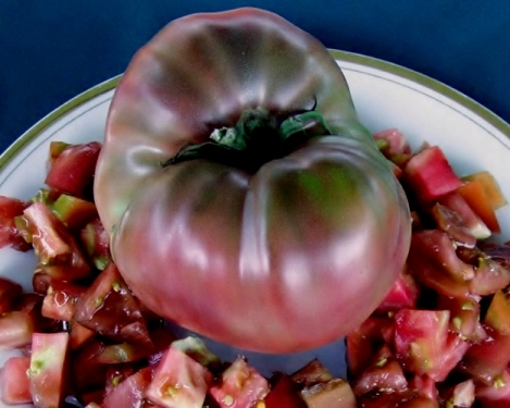 Carbon ($6.25) 78 days. This long-time favorite of mine is a real knock-out.  I've been custom growing it for several distinguished customers and they've convinced me to add it for 2015. It produces a heavy crop of 10 to 14 oz., beautiful purple-brown tomatoes; most fruits are darker than the one in the photograph making this among of the darkest of the black tomatoes with delicious, rich, complex flavors that we treasure in the black tomatoes. This high producing, richly flavored tomato is a favorite of market gardeners and chef