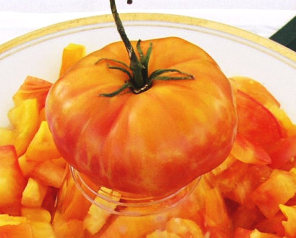 Oaxacan Jewel ( Wah - hah - kun) ($6.25)   85 days.  Wonderfully rich, sweet flavors make this stunning jewel-like tomato a huge favorite at tasting parties and in fine restaurants. These beautiful 1 to 2 lb. brilliant yellow beefsteak tomatoes with red streaks throughout the flesh make this one a chef's favorite for flavor and presentation. From the beautiful sate of Oaxaca, Oaxacan Jewel is gaining fans world wide and was among my best finds for the 2011 season.