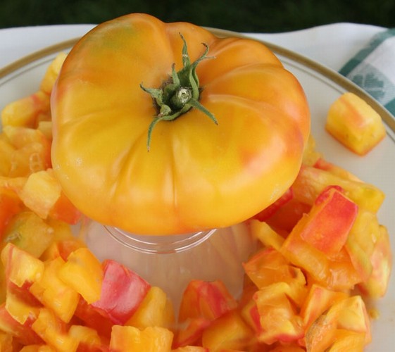 Juicy, very sweet and intensely tomatoey as if injected with concentrated tomato flavor. Ambrosial with a luxurious, silken texture, a lingering touch of sweetness and rich, earthy sweet flavors, high fruit yield and very few seeds.