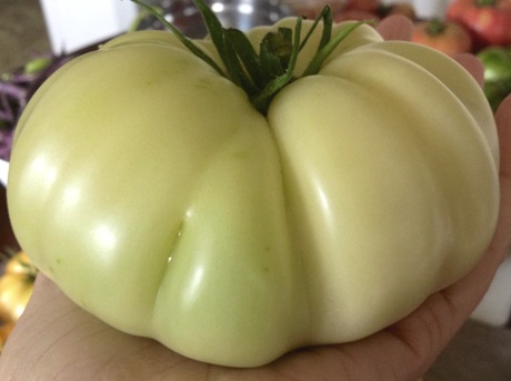 This ivory beauty is the closest to pure white you'll find in a tomato. 3" to 4" with an occasional pink blush on the blossom end at ripeness, its outstanding, all-season production of half-pound tomatoes with a bit of ruffling near the stem end and creamy white flesh, have made it a standout in my garden. For the heirloom gardener who wants dazzling beauty in the tomato garden. Growing in clusters of three to five fruits, its sweet, fruity, tropical flavor will beguile you with a fragrance that hints of rosewater.